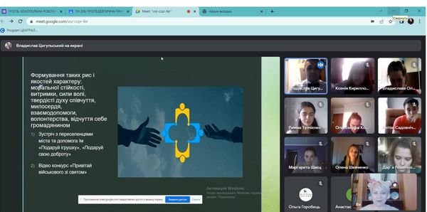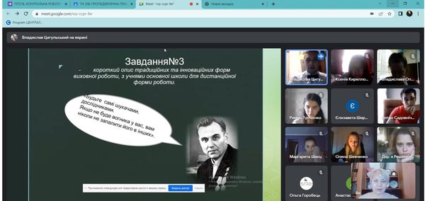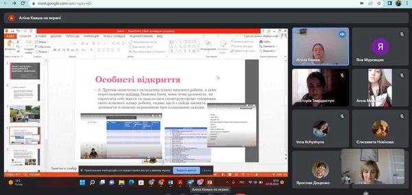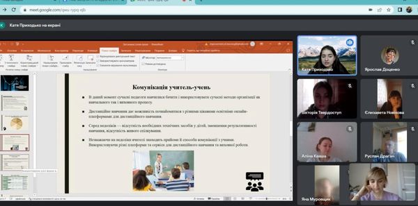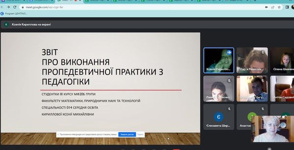 Під керівництвом групового методиста, к.п.н, доцента кафедри педагогіки та спеціальної освіти Кравцової Тетяни Олександрівни студенти спеціальностей 014 Середня освіта (Природничі науки), 014 Середня освіта (Біологія та здоров’я людини), 014 Середня освіта (Хімія), 014 Середня освіта (Географія) продемонстрували власні напрацювання за результатами виконання завдань практики, поділилися враженнями від проведеної роботи під час виконання різних завдань практики, презентували інноваційні методи та форми роботи під час дистанційного навчання.