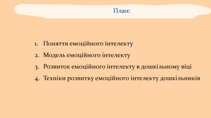 Учасники мали можливість ознайомитись із поняттям та моделлю емоційного інтелекту, структурою ознайомлення дітей із емоцією, техніками розвитку емоційного інтелекту дітей дошкільного віку.