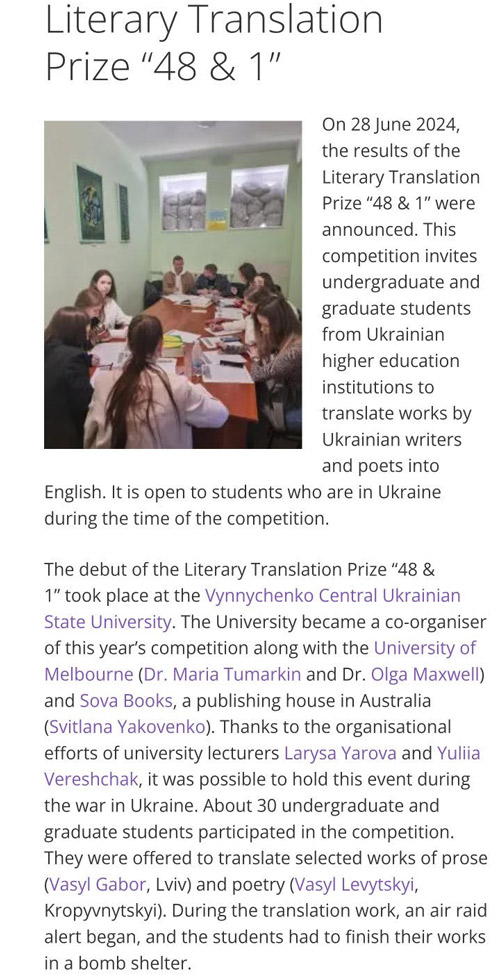 Важливо, що видавництво активно підтримує студентів факультету української філології, іноземних мов та соціальних комунікацій. Так, у травні 2024 року завдяки конкурсу художнього перекладу «48&One», організованого «Sova Books» та викладачами Університету Мельбурна разом з кафедрою перекладу, прикладної та загальної лінгвістики, студенти факультету випробували свої сили як перекладачі, а переможці змогли отримати чудові нагороди від організаторів. Впевнені, що така плідна співпраця є гарним прикладом для нашої студентської молоді, адже можна не лише вдосконалювати перекладацьку майстерність, але й поширювати світом українську історію й культуру, цінності та особливості.
