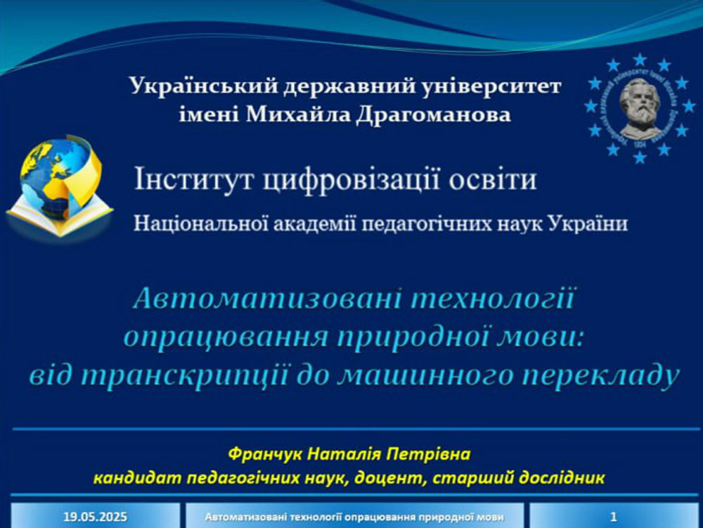 19 травня 2025 року для студентів 2, 3 та 4 курсів, які навчаються за освітньо-професійними програмами «Філологія (Прикладна лінгвістика (англійська мова) та Германські мови та літератури (переклад англійської мови включно))» та «Філологія (Германські мови та літератури (переклад англійської та німецької мови включно))», відбулася цікава та пізнавальна лекція на тему «Автоматизовані технології опрацювання природної мови: від транскрипції до машинного перекладу».