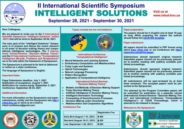 28-30 вересня на базі математичного факультету ДВНЗ «Ужгородський національний університет» в онлайн форматі проходив другий міжнародний симпозіум «Обчислювальний інтелект» IntSol 2021.