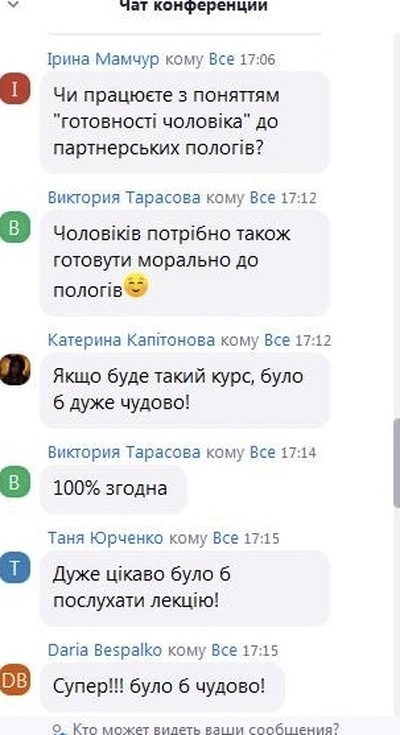 Мануйлова Ольга – керівник, засновниця мовної школи Giraffe Club та Донцова Ірина психолог цієї ж школи, Чебоненко Валентина – завідувачка обласного навчально-методичного центру психологічної служби системи освіти КЗ «КОІППО» імені Василя Сухомлинського, Дзюбас Наталія, Заболотня Ольга – методисти обласного навчально-методичного центру психологічної служби системи освіти КЗ «КОІППО імені Василя Сухомлинського, Ковальова Яна – директорка Кіровоградського обласного центру соціально-психологічної допомоги, Тарасова Марія – керівник фітнес-клубу «Драйв», Ліснича Олеся – перинатальний психолог, КНП «Кіровоградської обласної лікарні Кіровоградської обласної ради».