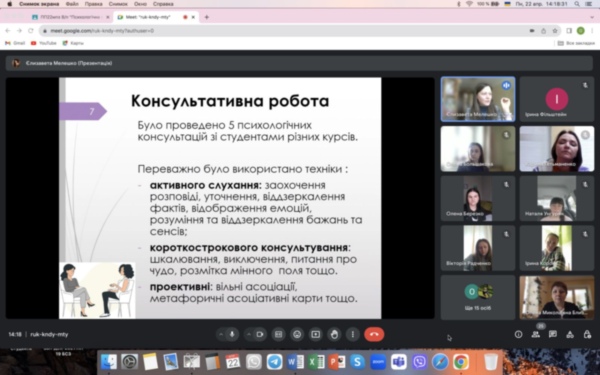 Здобувачі магістерського рівня вищої освіти використовували сучасні підходи до консультування та психологічної підтримки, проводили групові та індивідуальні психодіагностичні обстеження, займались просвітницькою та корекційно-розвивальною роботою з різними віковими категоріями клієнтів. Під час практики здобуто унікальний досвід роботи з проблемами адаптації, стресу та конфліктів, збереження ментального здоров’я під час війни.