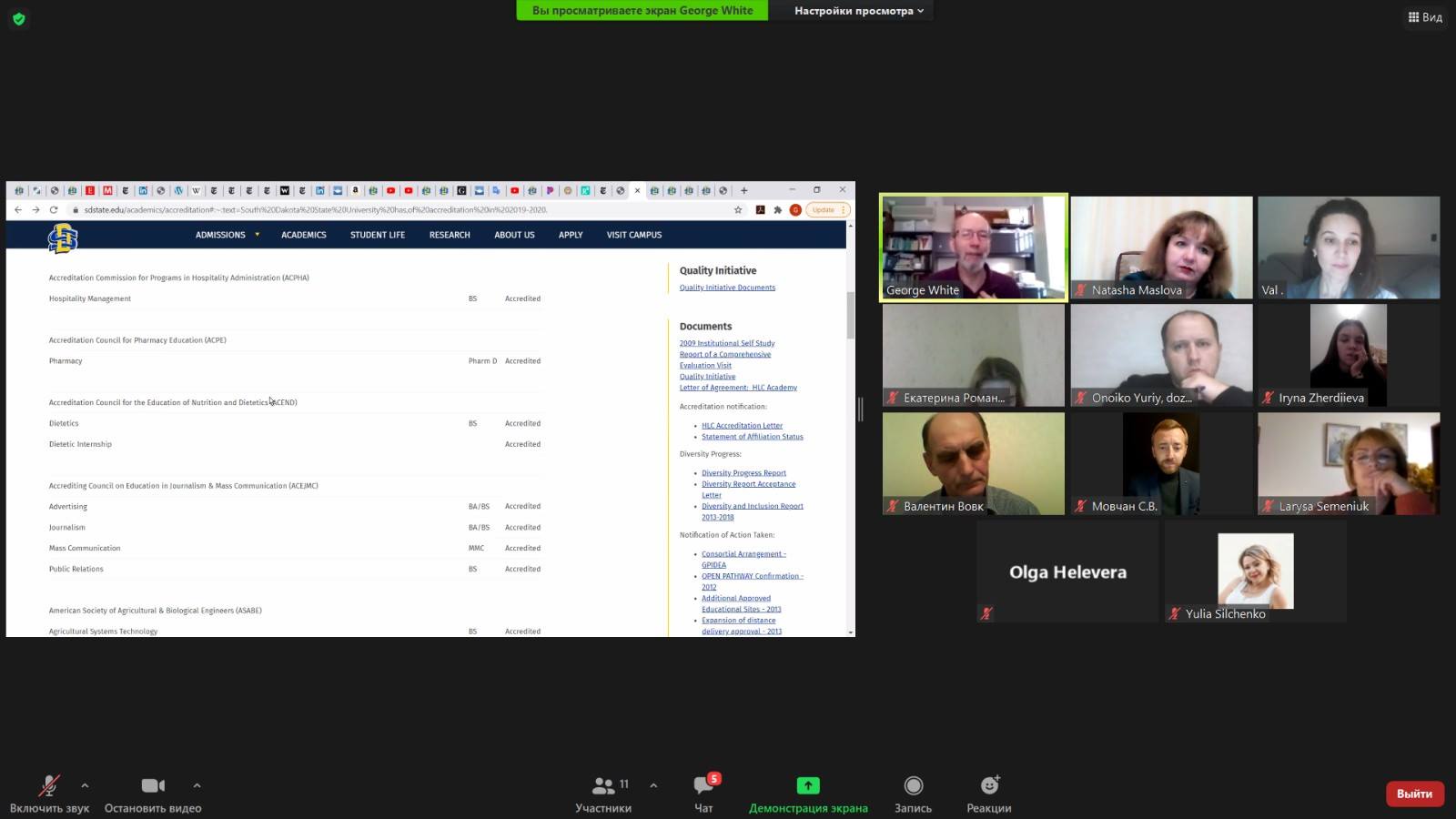 Учасниками семінару стали науково-педагогічні працівники кафедри географії та геоекології, представники органів студентського самоврядування природничо-географічного факультету ЦДПУ ім. В. Винниченка, а від кафедри географії та геопросторових наук державного університету штату Південна Дакота – член Американської асоціації географів та Національної ради з географічної освіти (США), професор Джордж Уайт. Зустріч відбувалася в режимі онлайн-відеоконференції з використанням платформи Zoom.