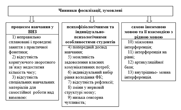 Виклад основного матеріалу. Результати аналізу наукової літератури, присвяченої вивченню особливостей та чинників фосилізації вимови студентів, наші власні спостереження за навчальним процесом та бесіди з викладачами ВНЗ дали змогу узагальнити чинники фосилізації, та представити їх схематично на рисунку. Варто зауважити, що на схемі зображені лише ті чинники, які є релевантними для нашого дослідження.