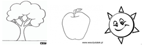 Każde z dzieci otrzymuje kartę pracy. Ich zadaniem jest pomalowanie znajdujących się tam przedmiotów na odpowiednie kolory (drzewko, jabłko, słonko).
