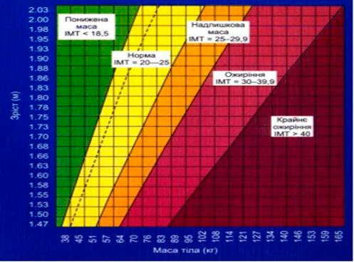 Оцінювати ожиріння тільки по ІМТ недостатньо. Важливо оцінити топографію розподілу жиру і відношення товстої і худої частин тіла. Підтримуйте свою масу тілапо формулі Кетле. Ідеальна маса тіла дорослої людини коливається в межах індексу маси тіла від 20 до 25 кг/м2 (рис. 1).