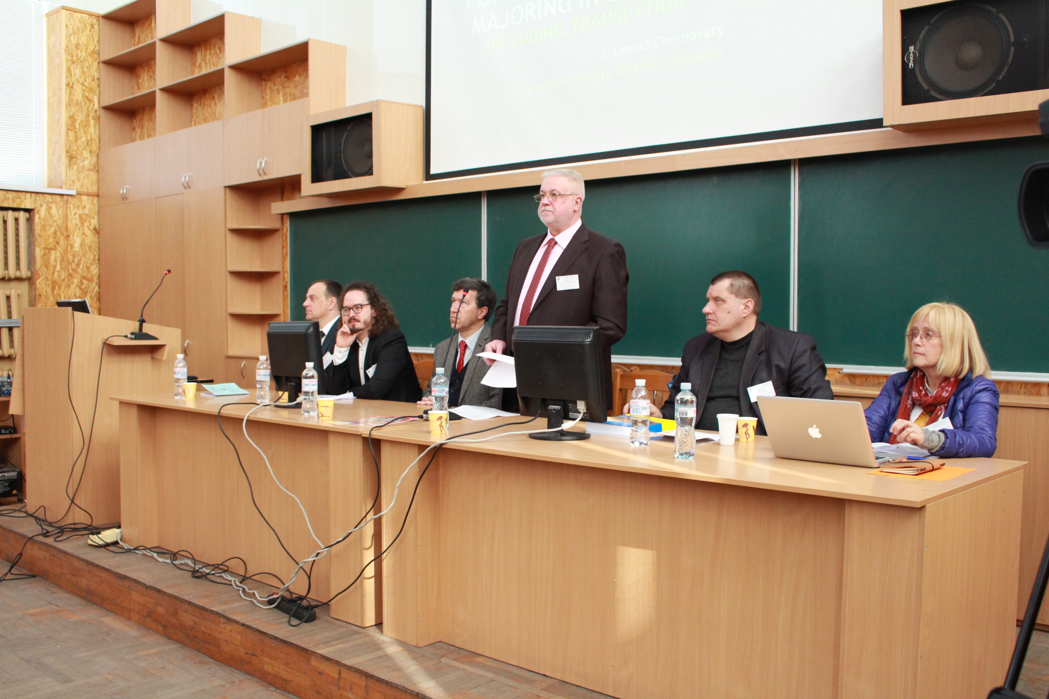 На пленарному засіданні конференції виступили професор Леонід ЧЕРНОВАТИЙ з цікавою доповіддю “ПРОЦЕДУРНІ Й ДЕКЛАРАТИВНІ ЗНАННЯ ПРИ ПЕРЕДАЧІ АНГЛОМОВНИХ ТЕРМІНОЛОГІЧНИХ СЛОВОСПОЛУЧЕНЬ У ГАЛУЗІ ПЕРЕКЛАДОЗНАВСТВА”; МАРТІНЕ ДАЛМАС, професор кафедри новітнього німецького мовознавства Інституту германських та скандинавських мов Університету Париж Сорбона (Франція) з доповіддю “ВИПИТІ МІНІ-БАРИ ТА МОКРІ ВІД СЛІЗ ПОДУШКИ: АНАЛІЗ СЕМАНТИЧНОЇ СТРУКТУРИ РЕЗУЛЬТАТИВНИХ КОНСТРУКЦІЙ В НІМЕЦЬКІЙ МОВІ”; МАРІЯ ІВАНИЦЬКА, доктор філологічних наук, професор, завідувач кафедри германської філології та перекладу Інституту філології Київського національного університету імені Тараса Шевченка виступила від імені Інститут філології та кафедри з вітальною адресою до ювілею факультету та презентувала цікаву доповідь: “МОВНА І КУЛЬТУРНА ПРИНАЛЕЖНІСТЬ У МУЛЬТІЕТНІЧНОМУ СЕРЕДОВИЩІ: ОЛЬГА КОБИЛЯНСЬКА ЯК ТРАНСКУЛЬТУРНА ОСОБИСТІСТЬ”; КОСТЯНТИН МІЗІН, доктор філологічних наук, професор, завідувач кафедри іноземної філології, перекладу та методики навчання Переяслав-Хмельницького державного педагогічного університету імені Григорія Сковороди проголосив доповідь “НІМЕЦЬКИЙ ЛІНГВОКУЛЬТУРНИЙ КОНЦЕПТ GÖNNEN У КРОСКУЛЬТУРНОМУ ВИСВІТЛЕННІ: ЕТНОУНІКАЛЬНІ СМИСЛИ”; ПІТЕР БУЛОНЬ, доктор наук, професор Льовенського Католицького університету м. Льовен, Бельгія, з яким факультет іноземних мов заключив у 2016 році угоду про співпрацю, презентував свою змістовну доповідь російською мовою: “КЛЮЧЕВАЯ РОЛЬ НЕМЕЦКИХ И ФРАНЦУЗСКИХ ПЕРЕВОДОВ В РАННЕМ ЕВРОПЕЙСКОМ ВОСПРИЯТИИ ДОСТОЕВСКОГО”; ОЛЕГ СЕМЕНЮК, ректор Центральноукраїнського державного педагогічного університету імені Володимира Винниченка, Заслужений працівник освіти України завершив пленарне засідання цікавою доповіддю: “ВІДДЗЕРКАЛЕННЯ СОЦІАЛЬНИХ І МОВНИХ ЯВИЩ ПОЧАТКУ ХХ СТОЛІТТЯ В ФЕЙЛЕТОНАХ ОСТАПА ВИШНІ”.