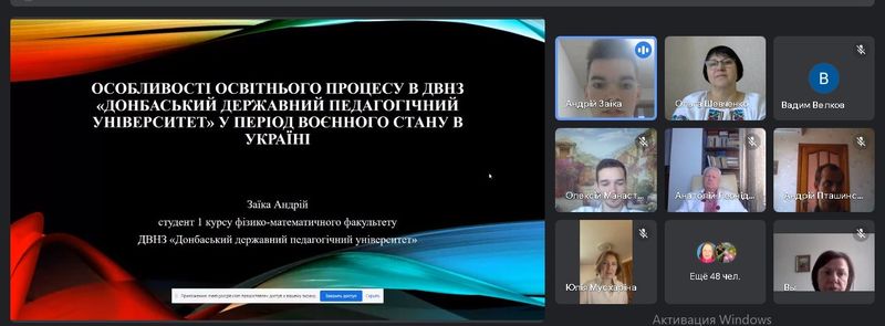 Аліна РОМАНЕНКО – студентка ІV курсу першого (бакалаврського) рівня вищої освіти з доповіддю «Дистанційні тренування зі спортивної акробатики». Науковий керівник – Олександр ХОЛОДНИЙ, кандидат педагогічних наук, доцент, декан факультету фізичного виховання Державного вищого навчального закладу «Донбаський державний педагогічний університет»; Андрій ЗАЇКА – студент І курсу першого (бакалаврського) рівня вищої освіти фізико-математичного факультету з доповіддю «Особливості освітнього процесу в Державному вищому навчальному закладі «Донбаський державний педагогічний університет» у період воєнного стану в Україні». Науковий керівник – Ірина ОСТОПОЛЕЦЬ, кандидат психологічних наук, доцент, доцент кафедри загальної психології Державного вищого навчального закладу «Донбаський державний педагогічний університет», м. Слов’янськ;