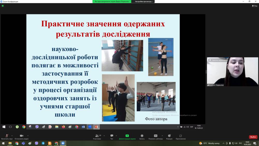 Студентка факультету фізичного виховання ЦДУ імені Володимира Винниченка 3 курсу предметної спеціальності «014.11 Середня освіта (Фізична культура)» Дар’я Ледньова представила наукове дослідження на тему: «Використання засобів фізичної культури у профілактиці порушень постави учнів старших класів» (науковий керівник: доцент Черній В.П.).