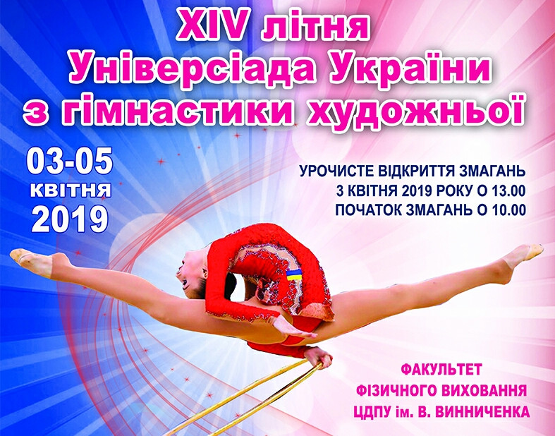 3-5 квітня 2019 року в спортивній залі факультету фізичного виховання державного педагогічного університету ім. Володимира Винниченка проходила ХІV літня Універсіада України з гімнастики художньої.