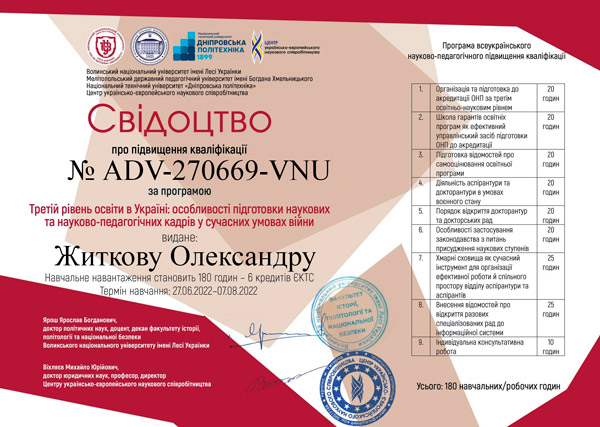Розробники освітньо-наукової програми (ОНП) «Історія та археологія» доценти кафедри історії України та всесвітньої історії О. Житков та О. Ковальков упродовж 180 навчальних годин, а це 6 кредитів ECTS, отримали можливість співпраці із провідними фахівцями ВНЗ нашої країни, обмінялися досвідом організації й підготовки до акредитації ОНП освітньо-наукового рівня доктора філософії. Складовою частиною програми були вимоги стосовно планування наукових проектів та формування практичних навичок, зокрема, з актуальної теми «Хмарні сховища як сучасний інструмент для організації ефективної роботи й спільного простору відділу аспірантури та аспірантів».