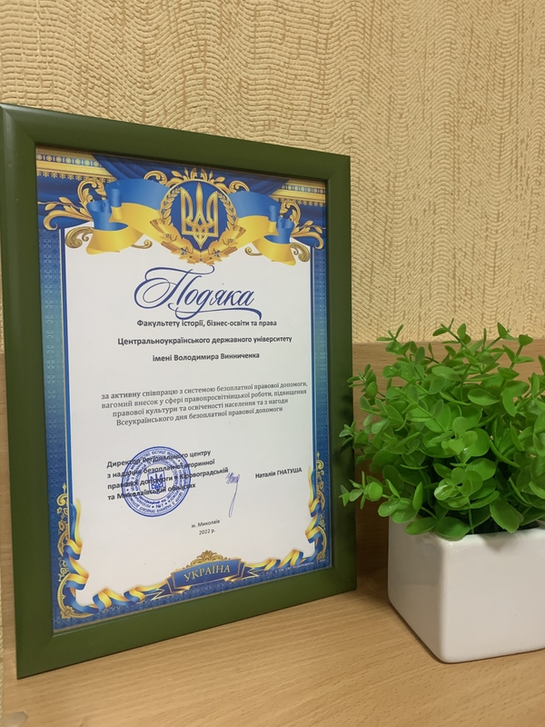 Факультет історії, бізнес-освіти та права ЦДУ імені Володимира Винниченка отримав подяку від Регіонального центру з надання БВПД у Кіровоградській та Миколаївській областях за активну співпрацю та вагомий внесок у сфері правопросвітницької роботи, підвищення правової культури та освіченості населення з нагоди Всеукраїнського дня безоплатної правової допомоги. Щиро вдячні за високу довіру та оцінку нашої співпраці.