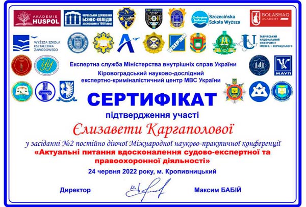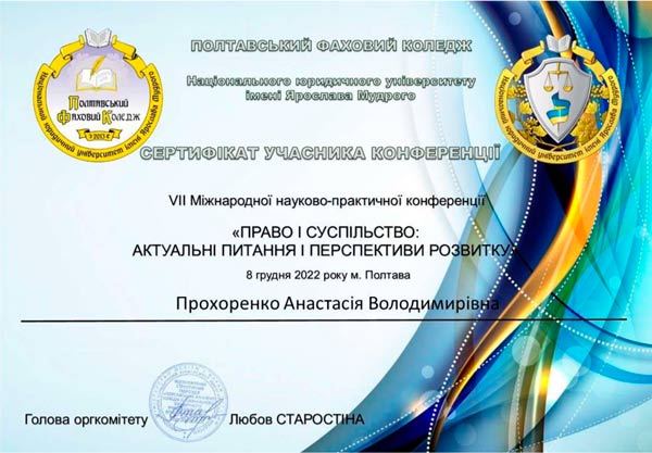 Здобувачі бакалаврського і магістерського рівнів вищої освіти за спеціальністю «081 Право» стали учасниками міжнародних конференцій – «Теоретичні та практичні проблеми реалізації норм права» (Кременчук), «Сектор безпеки України: актуальні питання науки та практик» (Харків), «Актуальні питання вдосконалення судово-експертної та правоохоронної діяльності» (Кропивницький), «Актуальні проблеми приватного та публічного права» (Харків), «Консолідація правової системи, як шлях до зміцнення державотворення» (Київ), та всеукраїнської конференції «Публічне управління: проведення реформи в Україні» (Київ).