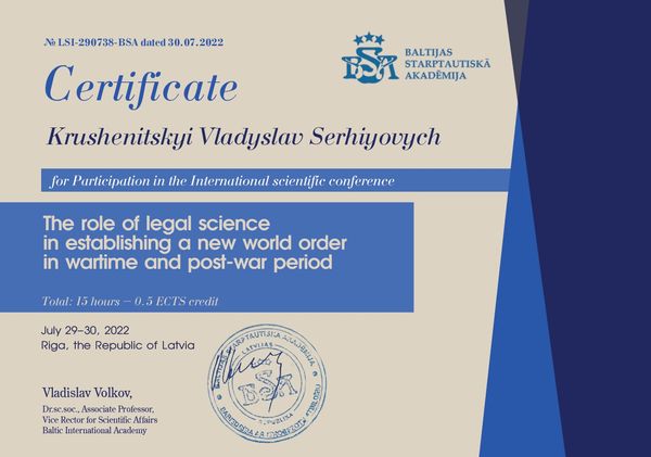 У рамках діяльності лабораторії під керівництвом Лілії Рябовол у 2022 році Владислав Крушеніцький (здобувач другого (магістерського) рівня вищої освіти, спеціальність «262 Правоохоронна діяльність») взяв участь у зарубіжній конференції «The role of legal science in establishing a new world order in wartime and post-war period» (Рига, Латвійська республіка).