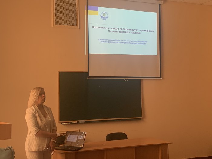 19 вересня 2023 року відбулася зустріч здобувачів освітніх програм «Право» та «Правоохоронна діяльність» з начальником відділення Національної служби посередництва і примирення в Кіровоградській області - Крайносвіт Оксаною Юріївною.