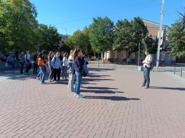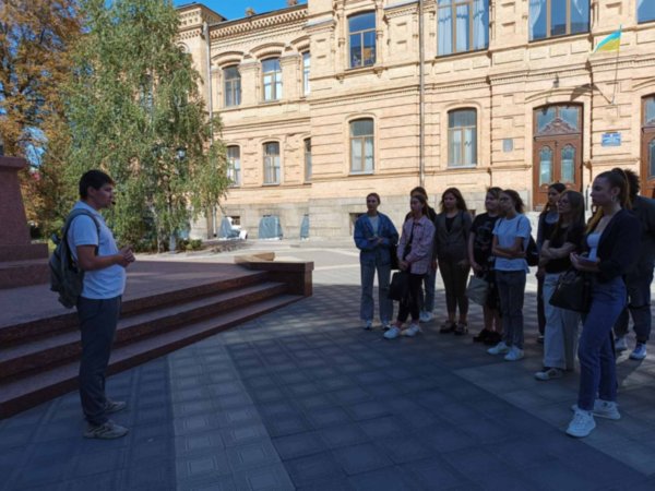 Знайомство із знаковими архітектурними та історичними місцями розпочалось від старого корпусу університету, де і навчаються студенти. Екскурсовод Мілютін С.Ю. ознайомив присутніх з історією будівництва корпусу Жіночої гімназії, початком творчості Театру Корифеїв, цікавими подробицями колишнього Юнкерського кавалерійського училища. Огляд вулиці Театральної та центральної частини міста дали можливість дізнатися про визначні роботи архітекторів О.Л. Лішневського та Я.В. Паученка. Під час екскурсії студенти дізналися про особливості “цегляного” модерну, ознайомились із діяльністю міського голови О.М.Пашутіна у розбудові міста. Для першокурсників історія міста отримала нове емоційне забарвлення через унікальну архітектуру та видатних зодчих.
