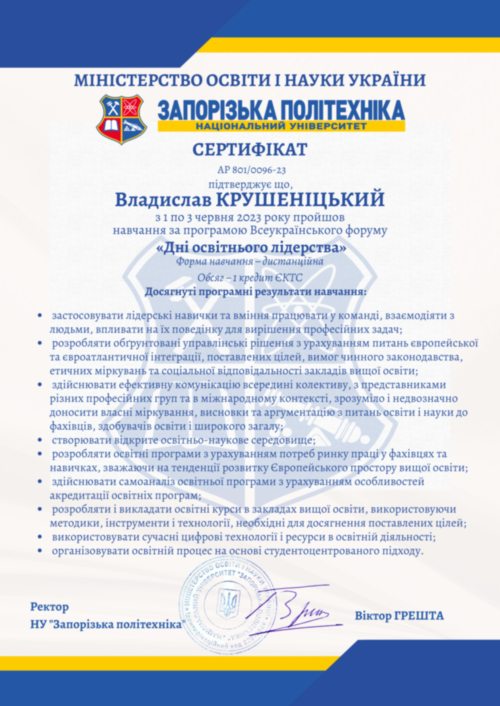 Упродовж 2023 року аспірант кафедри права та правоохоронної діяльності Владислав Крушеніцький взяв участь у двох Всеукраїнських освітньо-наукових заходах. Зокрема, 1-3 червня 2023 року на базі НУ «Запорізька політехніка» проходив Всеукраїнський форум «Дні освітнього лідерства». Спікерами панельних сесій виступили представники Національного агентства із забезпечення якості вищої освіти, Національного агентства кваліфікацій, члени Національної команди експертів з реформування вищої освіти, учені НАПН України, науково-педагогічні працівники вітчизняних ЗВО.