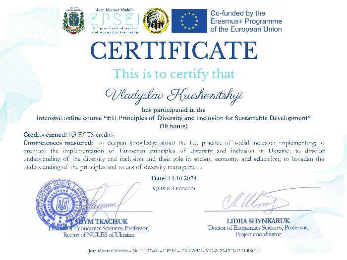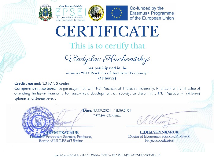 За результатами успішного проходження відповідних освітніх заходів отримано сертифікати та сертифікат про проходження практикуму «Інклюзивна економіка та суспільство ЄС: підходи, практики та принципи» обсягом 3 кредити ECTS.