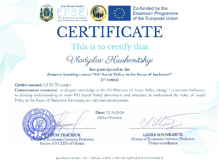 Упродовж вересня–жовтня 2024 року здобувач ОП «Право» третього (освітньо-наукового) рівня вищої освіти Владислав Крушеніцький узяв участь у низці освітніх заходів у межах проєкту Erasmus+ Jean Monnet «Практики соціальної та економічної інклюзії в ЄС» (EPSEI).