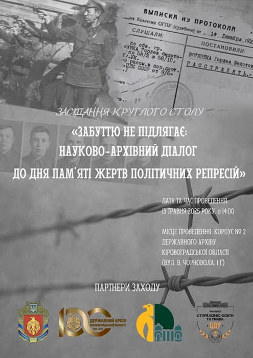 У співпраці із Державним архівом Кіровоградської області та Центральноукраїнським обласним краєзнавчим музеєм здобувачі освіти факультету історії, бізнес-освіти та права 13 травня взяли участь у роботі круглого столу «Забуттю не підлягає: науково-архівний діалог до дня пам’яті жертв політичних репресій».