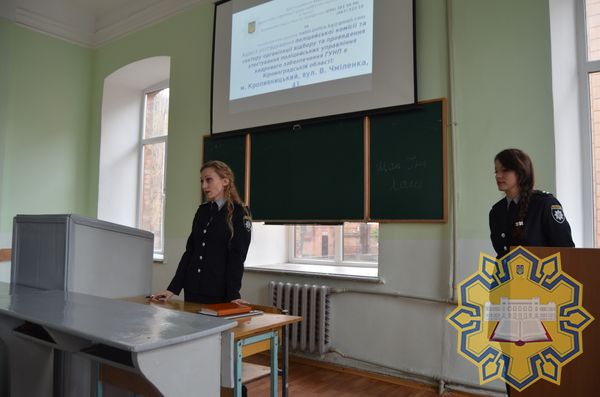 На факультет історії та права на зустріч із студентами-правознавцями випускного курсу завітали керівники Управління кадрового забезпечення ГУ Національної поліції в Кіровоградській області Човпан А.Г. і Яковенко О.С., які із демонстрацією відеоматеріалів проінформували присутніх студентів щодо порядку відбору кандидатів на службу в Національну поліцію та умов проходження служби, відповіли на поставлені їм запитання.