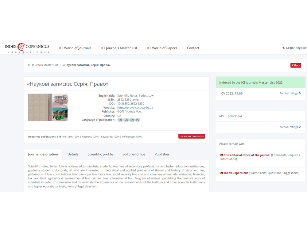 Наприкінці 2023 року відбулася чергова індексація випусків наукового фахового видання «Наукові записки. Серія: Право» за 2022 рік.