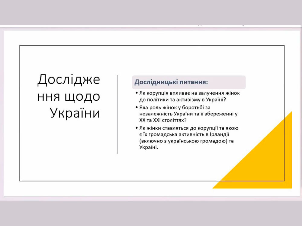 Важливою складовою освітньо-наукового процесу є взаємодія та обмін досвідом реалізації актуальних наукових проектів. Нещодавно здобувачі третього освітньо-наукового рівня вищої освіти спеціальності 032 Історія та архологія ЦДУ імені Володимира Винниченка долучилися до презентації проекту «Corruption, Gender, and Sustainable Development», який реалізовується у вищому навчальному закладі Республіки Ірландії - Дублінському Міському Університеті. Організований Радою студентського самоврядування факультету адвокатури Національного юридичного університету імені Ярослава Мудрого, захід викликав чимало запитань практичного характеру, зокрема, стосовно планування, методики реалізації напрямків дослідження даного проекту.