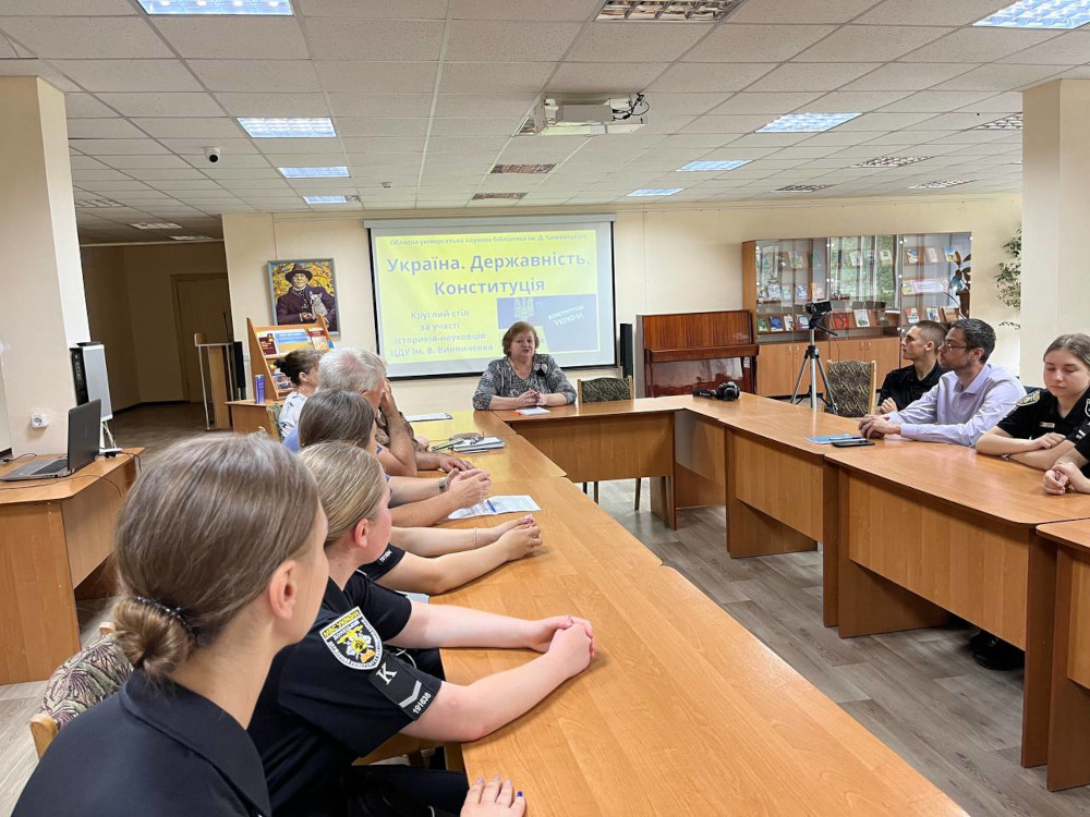 Основному закону нашої держави виповнилося 26 років. На відзначення цієї події викладачі кафедри історії України та всесвітньої історії провели круглий стіл на тему "Україна. Державність. Конституція". Захід пройшов у затишному залі обласної наукової бібліотеки імені Д. Чижевського. До розмови про конституційні традиції України були залучені викладачі Бабак О.І., Вівсяна І.А., Ковальков О.Л., Марченко О.М., курсанти Донецького університету внутрішніх справ, працівники бібліотеки та члени дискусійного клубу "Кліо".
