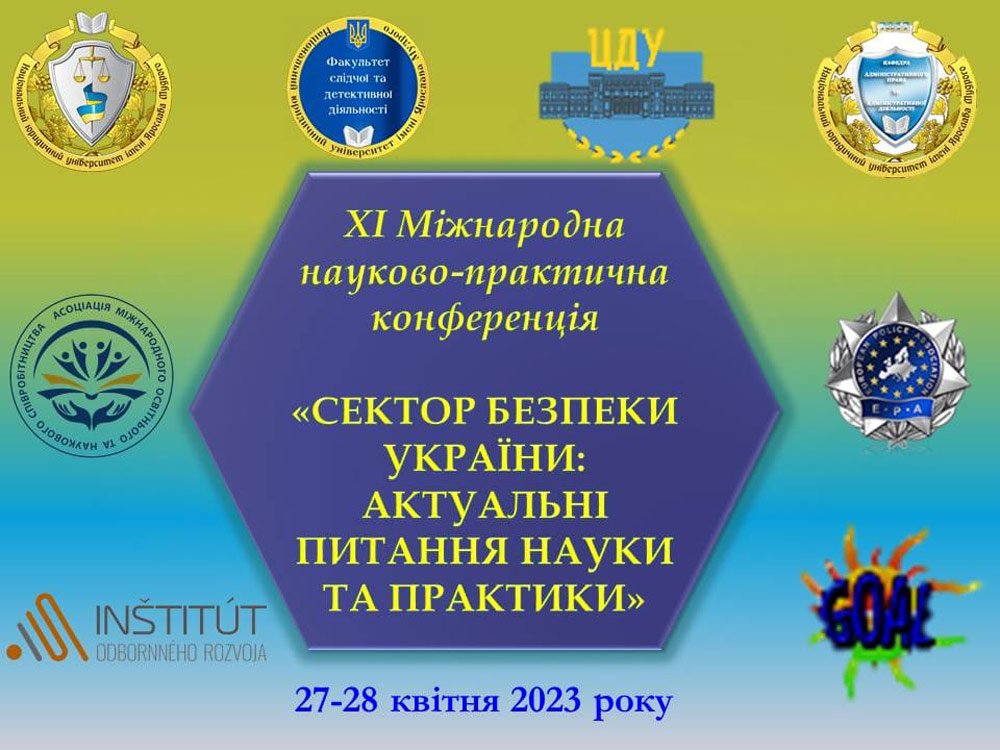 Кафедра права та правоохоронної діяльності Центральноукраїнського державного університету імені Володимира Винниченка стала співорганізатором ХІ Міжнародної науково-практичної конференції «Сектор безпеки України: актуальні питання науки та практики», яка відбулася на базі Національного юридичного університету імені Ярослава Мудрого 27-28 квітня 2023 року.