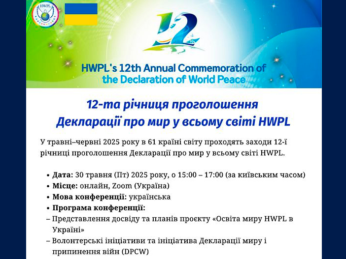 30 травня 2025 року відбувся Захід до 12-ої річниці проголошення Декларації про мир у всьому світі HWPL (онлайн-конференція в Україні).