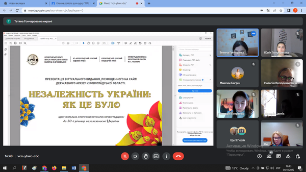 4 жовтня 2022 року студенти відвідали онлайн-виставку архівних матеріалів «Документально-історичний фотонарис — Незалежність України: як це було». Віртуальне видання репрезентувала Тетяна Гончарова, начальник відділу інформації Державного архіву Кіровоградської області.
