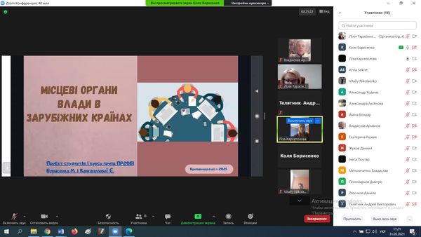 31 травня 2021 року студенти бакалаврату факультету історії та права за спеціальністю «081 Право» презентували свої проєкти з вивчення досвіду державного управління та місцевого самоврядування провідних країн світу.