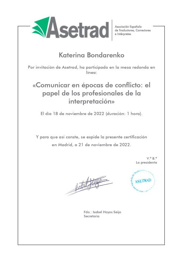 18 листопада 2022 року доцент кафедри перекладу, прикладної та загальної лінгвістики Катерина Бондаренко виступила на круглому столі «Comunicar en épocas de conflicto: el papel de los profesionales de la interpretación», організованому ASETRAD (Асоціацією усних та письмових перекладачів та редакторів Іспанії). Співдоповідачами стали Кристобал Осуна, голова відділу іспанського перекладу в ООН, Женева), Кармен лас Ерас, голова відділу усного та письмового перекладу урядової організації CEAR (Іспанської комісії допомоги біженцям), Діана П’єнавська, усна перекладачка, що надає послуги тимчасово переміщеним українцям в Іспанії.