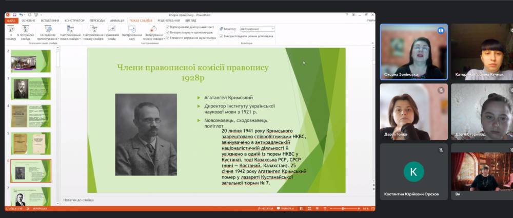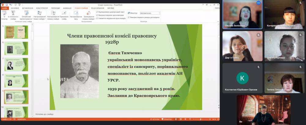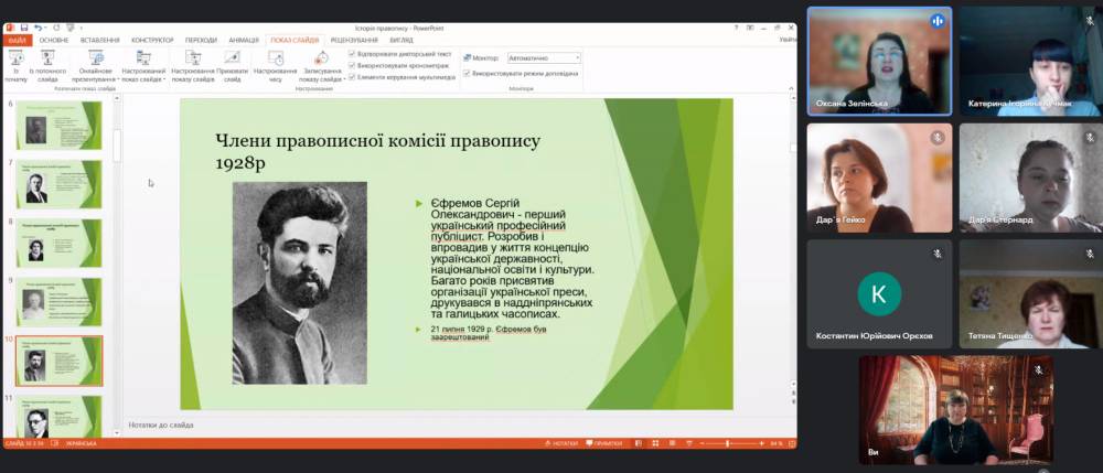 Знана історикиня мови розповіла про тяглість традиції запропонованих змін у редакції «Українського правопису» 2019 року, про непросту долю найвідоміших членів правописної комісії А. Ю. Кримського, О. Н. Синявського, І. І. Огієнка, О. Б. Курило, Є. К. Тимченка, С. О. Єфремова, Л. А. Булаховського та інших – творців орфографічно-пунктуаційного кодексу 1928 року. Продемонструвала історичні пам’ятки, праці різних жанрів і стилів, приклади з художньої літератури, що засвідчують основні питомі риси української мови.