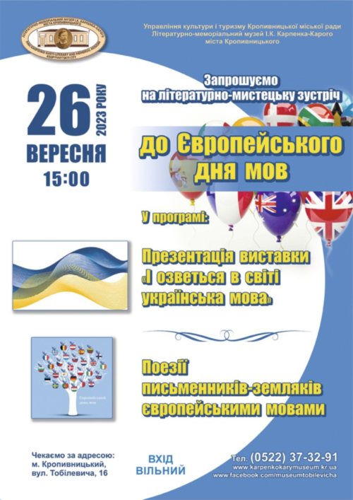 26 вересня 2023 року в Кропивницькому відбувалася низка заходів до Європейського дня мов. Зокрема, в стінах Літературно-меморіального музею І. К. Карпенка-Карого пройшла літературно-мистецька зустріч, присвячена творчості наших літераторів-земляків у перекладах мовами європейської спільноти: Володимира Винниченка, Ярослава Івашкевича, Ольгерда Бочковського, Євгена Маланюка, Юрія Яновського, Василя Козаченка, Сави Голованівського, Людмили Скирди, Віктора Близнеця, Костянтина Оверченка, молодого покоління — Надії Гармазій, Станіслава Новицького, Аліни Шевченко та інших.