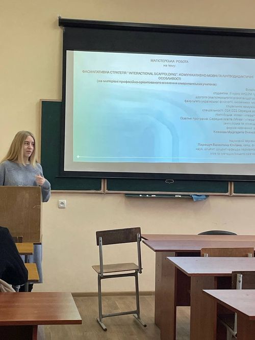 Магістерські дослідження, виконані у річищі іншомовної лінгводидактики, висвітлили актуальні питання сучасної науки за профілем освітніх програм. Зокрема, предметом розгляду здобувачів стали граматичні засоби вираження майбутнього часу в підручниках англійської мови для старшої школи, дискурсивні маркери організації англомовного академічного есе (на матеріалі IELTS Writing Task 2), комунікативно-мовні й лінгводидактичні особливості фасилітативної стратегії “interactional scaffolding” у професійно-орієнтованому мовленні американських учителів, англійські модальні дієслова семантичного поля «необхідність» на старшому етапі навчання, специфіка англійських навчальних текстів для розвитку вміння усної рецепції (на матеріалі завдань тесту IELTS), особливості фразових дієслів як засобу розвитку англомовної граматичної компетентності, лінгвістичні й дидактичні характеристики блогінгу як жанру англомовної онлайн взаємодії та комунікативного вміння учнів 10 класу, лінгводидактичні особливості мовних одиниць ЛСП «Food and Eating Habits» як ресурсу збагачення лексичного інвентарю учнів, граматична специфіка навчальних текстів у підручниках німецької мови для 10-11 класів, групова робота на уроці німецької мови як засіб розвитку комунікативної компетентності учнів.
