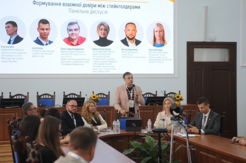Під час панельної дискусії “Формування взаємної довіри між стейкголдерами” викладач нашої кафедри представив свою позицію стосовно паритетності участі зацікавлених осіб-представників академічної та галузевої спільнот у формуванні та оновленні освітніх програм. Доповідь ґрунтувалась на основі системного аналізу понад 30 перекладацьких магістерських програм України щодо впливу на них роботодавців, і викликала дискусії, які було продовжено в кулуарах.