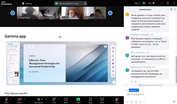 Лекція була проведена на платформі Zoom лекторкою, кандидатом технічних наук, запрошеною дослідницею Єнського університету, викладачкою SET University, Ольгою Каніщевою. Студенти та викладачі отримали безліч нової корисної інформації щодо різних платформ, чат-ботів та програм генеративного штучного інтелекту для розв’язання повсякденних, а головне професійних задач у сфері перекладу та прикладної лінгвістики. Тема виявилася настільки актуальною, що студенти буквально засипали пані Ольгу питаннями. Обговорення вийшло активним та продуктивним. Дякуємо пані Ользі та Єнському університету за можливість збагатитися такими потрібними у наш час знаннями!