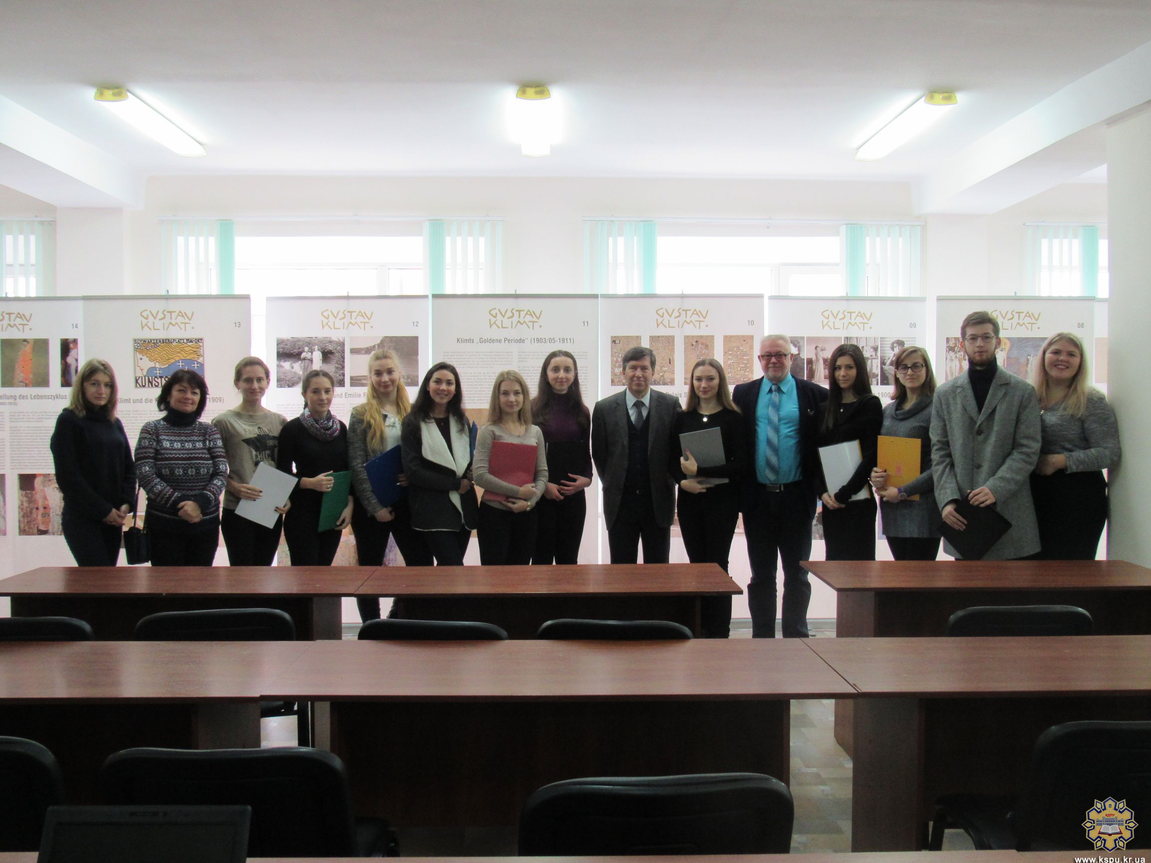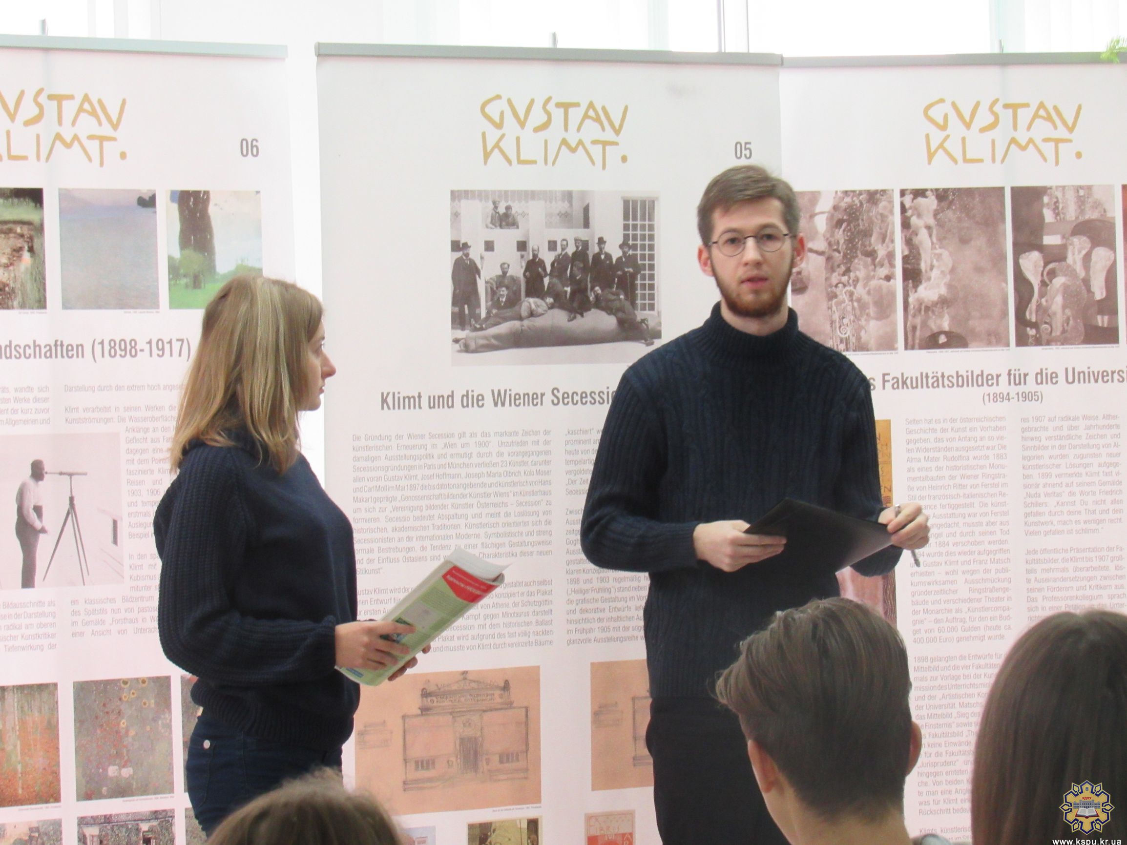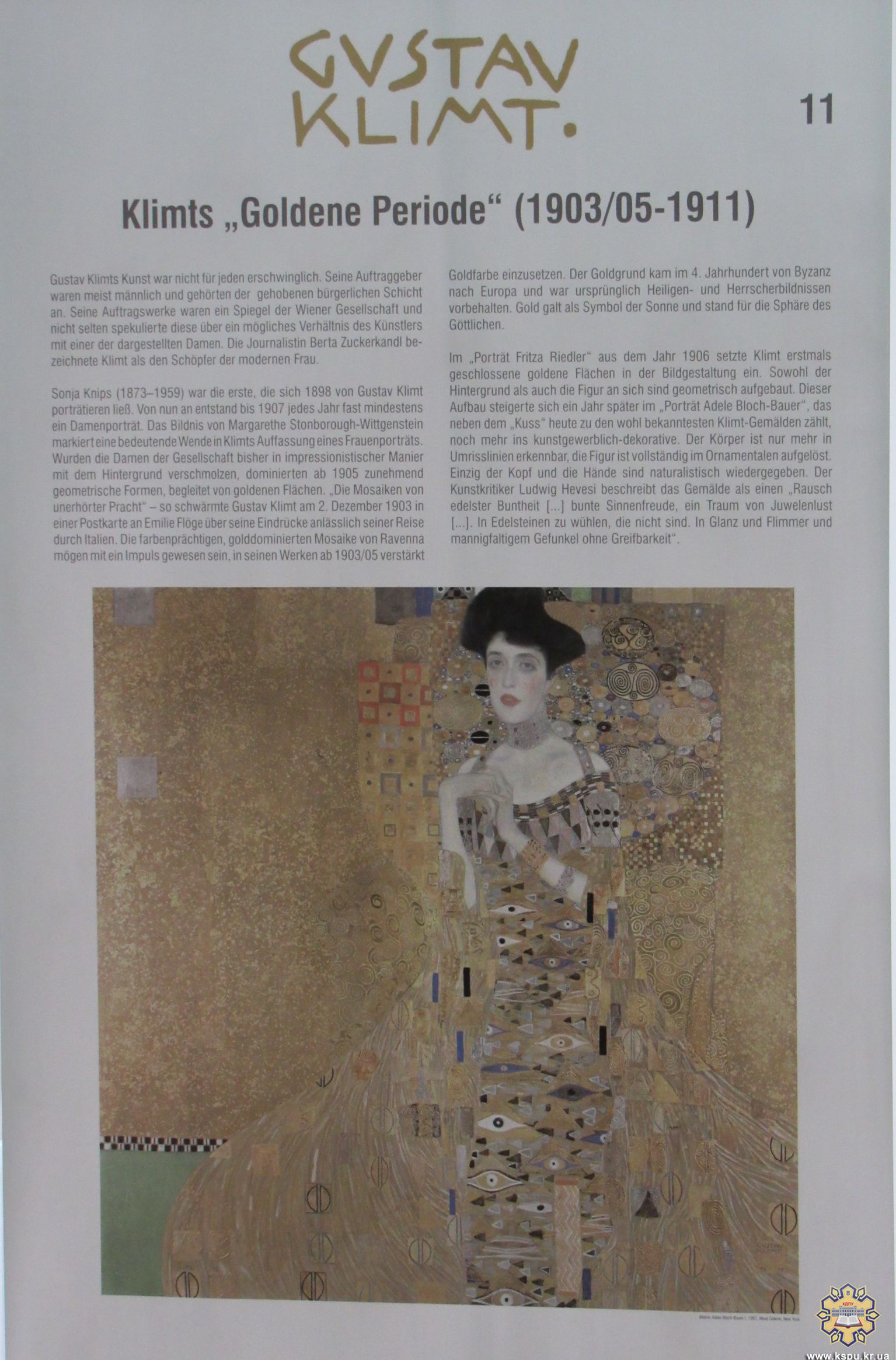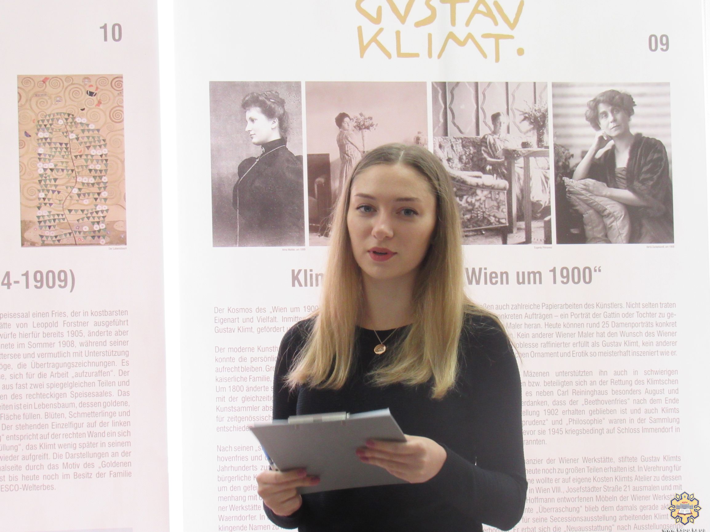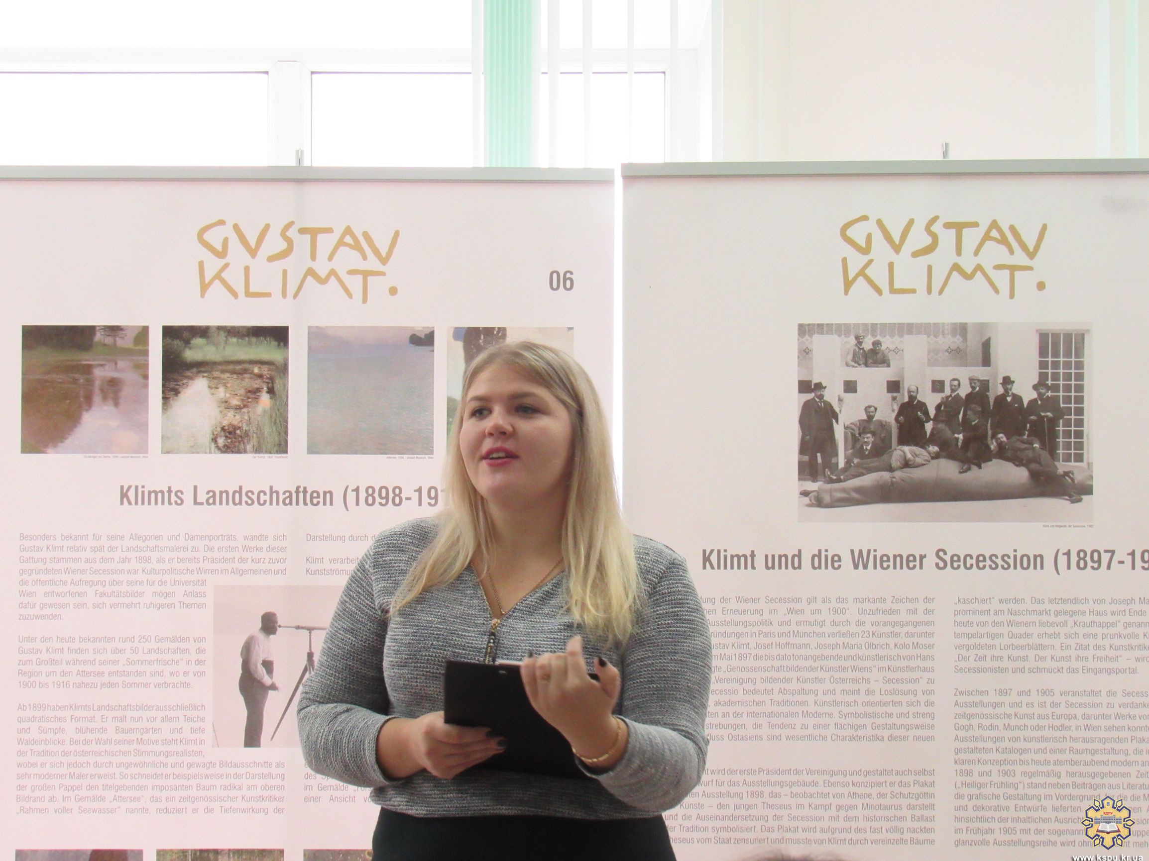 14 листопада у залі наукової австрійської бібліотеки ім. Бернгарда Штільфріда відбулося відкриття виставки «Густав Клімт – новатор модернізму», яка стала можливою за підтримки Австрійської служби академічних обмінів, Австрійського культурного форуму та організації «Австрійські бібліотеки за кордоном». Присутні на заході, серед яких ректор університету проф. О.А. Семенюк, декан факультету іноземних мов проф. О.М. Білоус, заступники декана доц. Н.В. Іваненко та викл. О.С. Леонідов, завідувач кафедри німецької мови та методики її викладання доц. І.В. Пянковська, викладачі університету доц. Л.Л. Семенюк, доц. Г.П. Апалат, доц. М.М. Тарнавська, Л.М. Кіт та студенти університету, мали змогу послухати цікавий та вичерпний огляд про життя митця, його професійне становлення та творчу спадщину. Презентацію підготували студенти факультету іноземних мов.