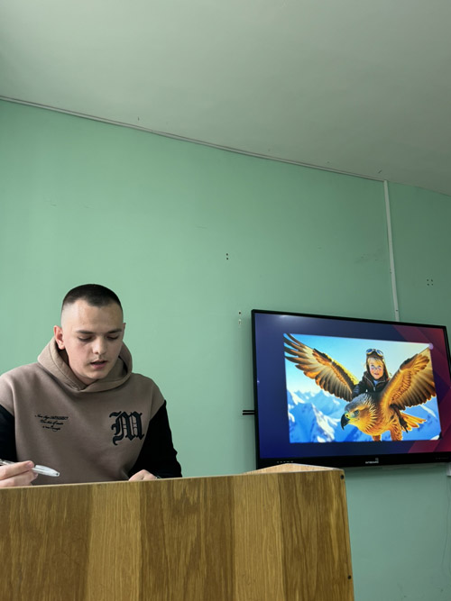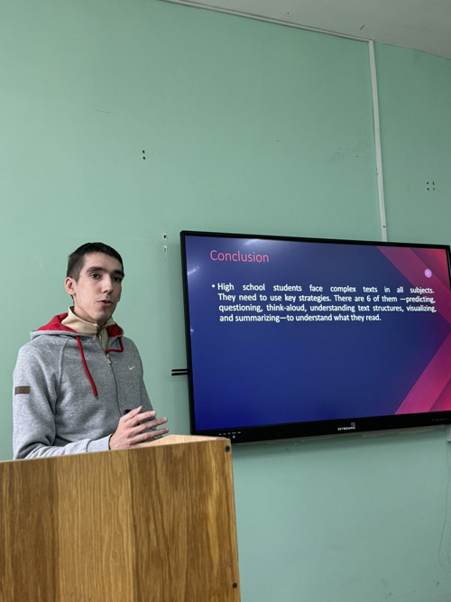 Магістрант Олександр Бутовський представив комплекс вправ, які використовуються на передтекстовому, текстовому та післятекстовому етапах читання тексту. Він також продемонстрував постери, які можна створювати за допомогою ШІ.