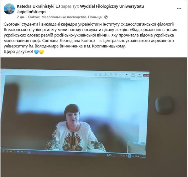 15 травня 2025 року, у Міжнародний день вишиванки, професор С.Л.Ковтюх прочитала гостьову лекцію «Віддзеркалення в нових українських словах реалій російсько-української війни» студентам і викладачам кафедри україністики Інституту східнослов’янської філології Ягеллонського університету в м. Кракові. Це один із найстаріших вишів у Європі та один із найбільших у Польщі.