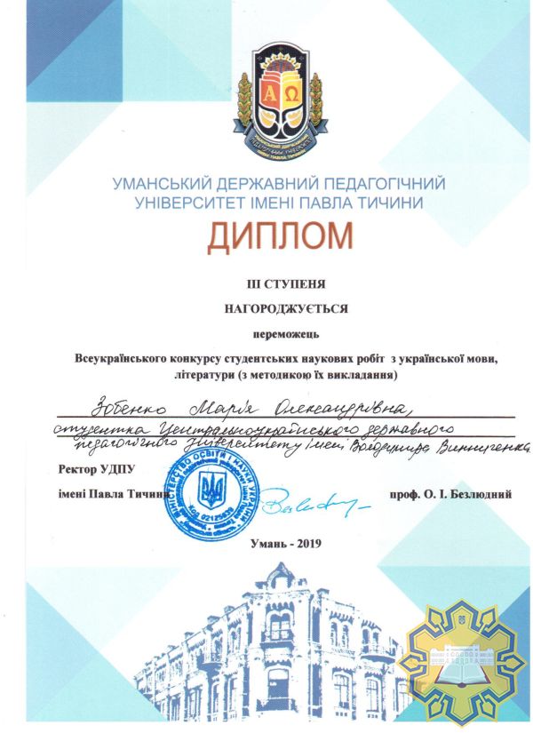 Кафедра української мови щиро вітає нашу переможницю – Зобенко Марію Олександрівну, нагороджену дипломом ІІІ ступеня за наукову роботу на тему: «Структурно-словотвірні параметри менюонімів».