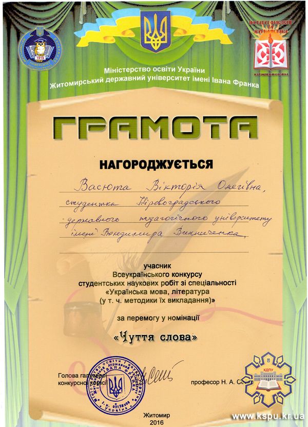 17 березня 2016 року в місті Житомирі відбувся другий фінальний етап Всеукраїнського конкурсу студентських наукових робіт зі спеціальності «Українська мова, література (у т.ч. методики їх викладання)». Честь факультету філології та журналістики захищала студентка 42-ї групи Васюта Вікторія.