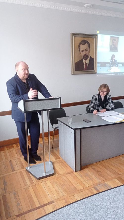 В обговоренні звіту голови профкому О. О. Горської про роботу профспілкового комітету університету за 2023 рік узяли участь ректор університету професор Є. Ю. Соболь та голова ОКП С. Ю. Петров.
