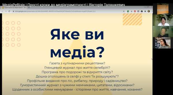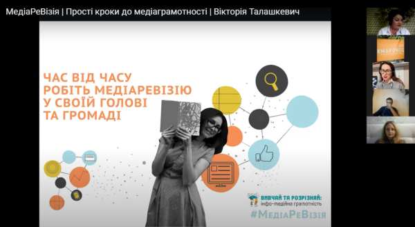 Учасники проєкту «МедіаРеВізія» 9 грудня почали прокачувати свої навички. На онлайн-конференції «Прості кроки до медіаграмотності» під керівництвом координаторки громадської організації «Прес-клуб реформ» Вікторії Талашкевич вони вчилися, як не потонути в інформаційній лавині 21-го сторіччя, не піддаватися на маніпуляції фейсбук-ботів та слідкувати за тим, що відбувається на сторінках у соціальних мережах.