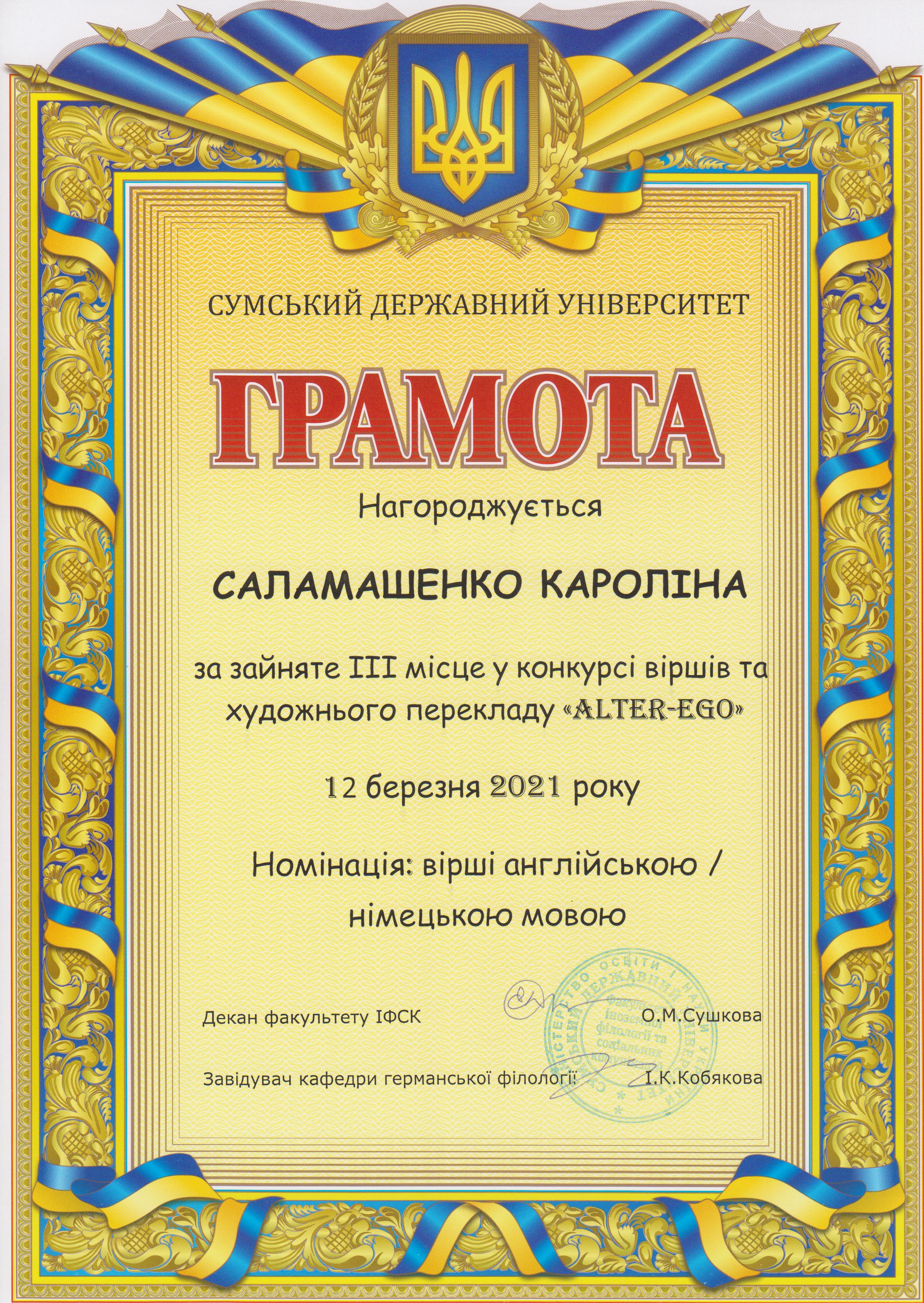 Студентки 3 курсу факультету іноземних мов Олександра Сальнікова та Кароліна Саламашенко стали призерками Всеукраїнського конкурсу поезій та художнього перекладу “Alter Ego”, який проводив Сумський державний університет. Олександра посіла почесне 3-тє місце у номінації «Вірш українською мовою». Кароліна – 3-тє місце у номінації «Вірш англійською мовою».