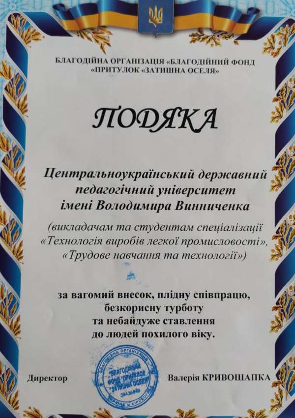 Особливу подяку учасники висловлюють директорці «Гончаренко центру» Вікторії Олегівні Талашкевич, директорці Кропивницького професійного ліцею сфери послуг та торгівлі Людмилі Олексіївні Снєжко та заступниці директора Вікторії Саввичні Алексеєвець за ініціювання благодійних заходів та згуртування небайдужих громадян.