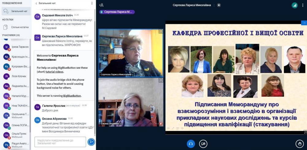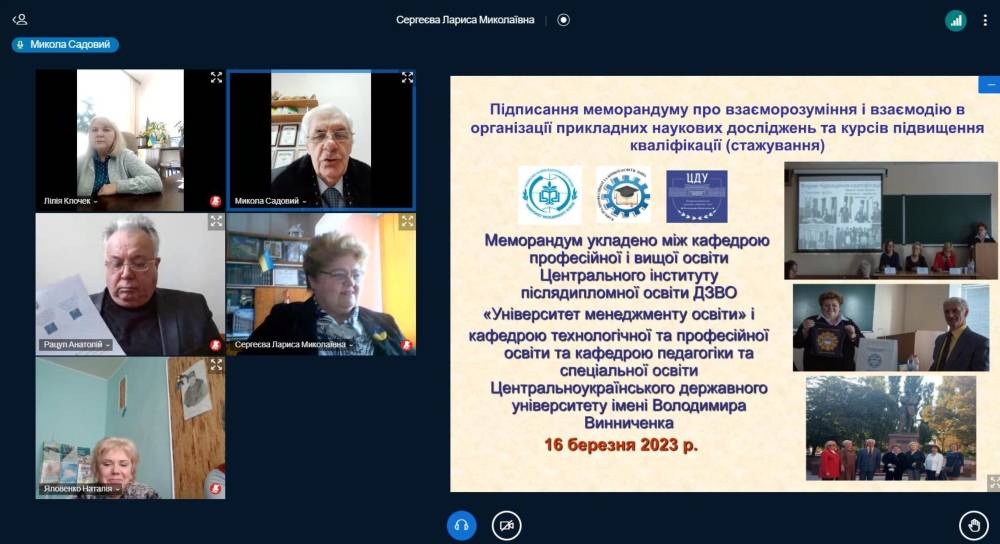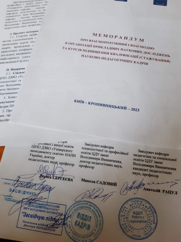 16 березня 2023 року у режимі онлайн відбулась процедура публічного підписання тексту Меморандуму між кафедрою професійної і вищої освіти ДЗВО «Університет менеджменту освіти» (завідувач – професор Лариса Сергеєва), кафедрою технологічної та професійної освіти (завідувач – професор Микола Садовий) та кафедрою педагогіки та спеціальної освіти (завідувач – професор Анатолій Рацул) Центральноукраїнського державного університету імені Володимира Винниченка.