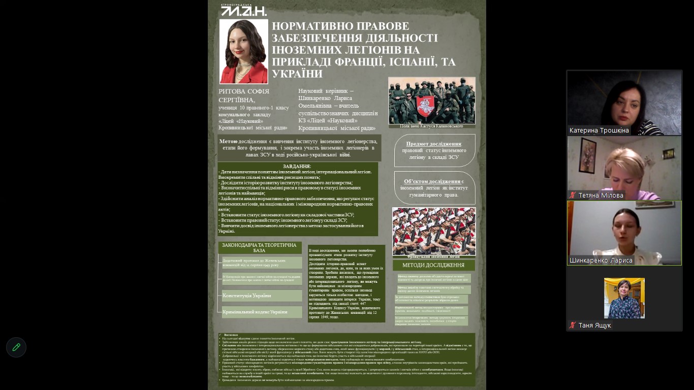 Вихованці відділення правознавства представили 9 актуальних та цікавих тем: «Нормативно-правове регулювання особистих немайнових репродуктивних прав у цивільному законодавстві», «Репарація як форма міжнародно-правової відповідальності держав», «Трудова експлуатація дітей в умовах збройного конфлікту», «Нормативно-правове забезпечення діяльності іноземних легіонів на прикладі Франції, Іспанії та України», «Шлюбний договір як гарантія забезпечення майнових прав подружжя» тощо. Декілька тем були присвячені різним групам прав внутрішньо переміщених осіб і проблемам їхнього забезпечення.